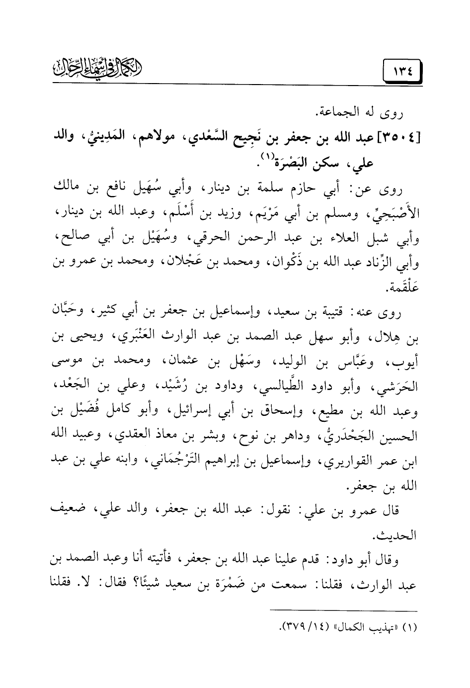 [٣٥٠٤] عبد الله بن جعفر بن نَجِيح السَّعْدي، مولاهم، المَدِينيُّ، والد علي، سكن البَصْرَة (¬١).