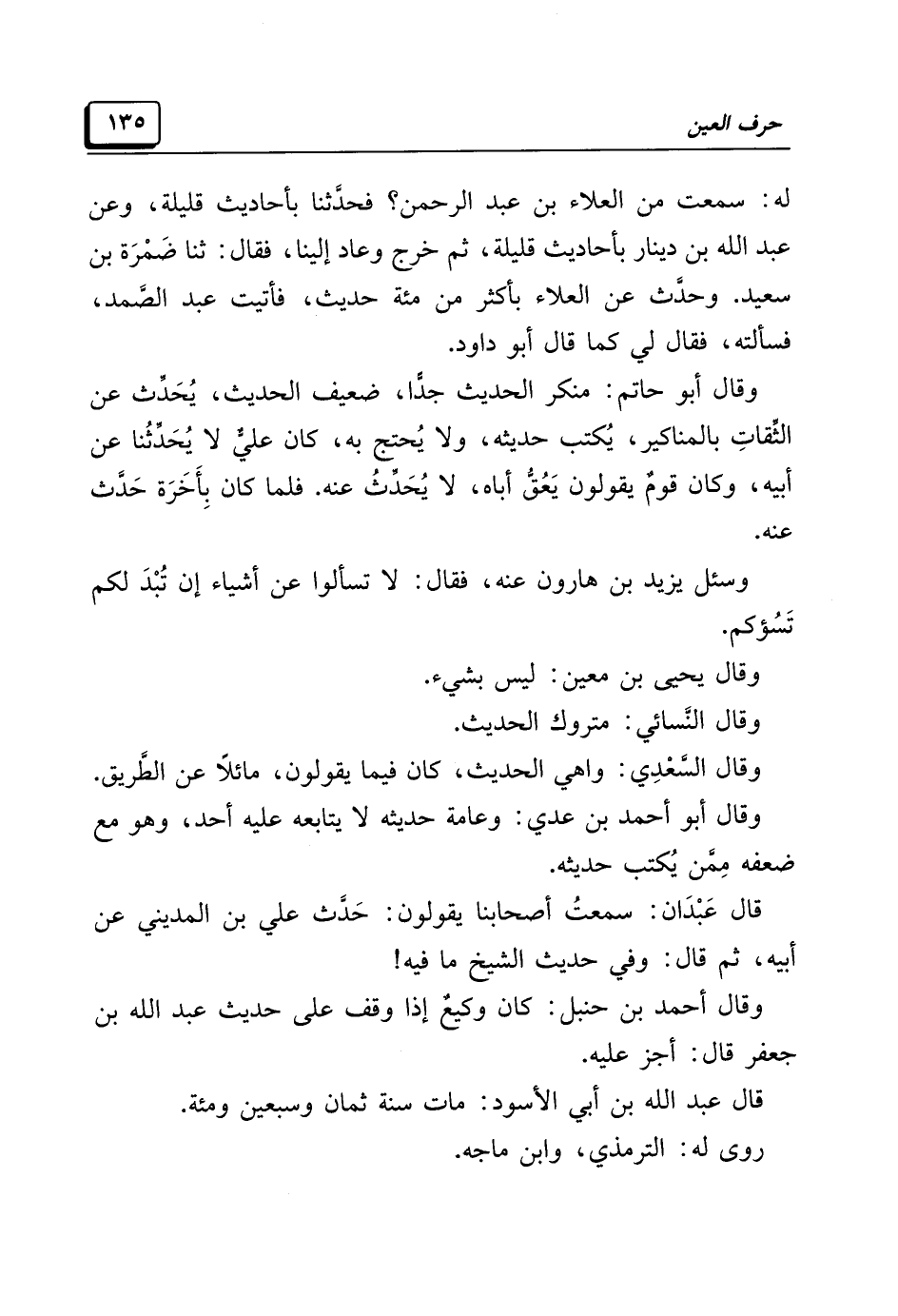 وقال أبو حاتم: منكر الحديث جدًّا، ضعيف الحديث، يُحَدِّث عن الثِّقاتِ بالمناكير، يُكتب حديثه، ولا يُحتج به، كان عليٌّ لا يُحَدِّثُنا عن أبيه، وكان قومٌ يقولون يَعُقُّ أباه، لا يُحَدِّثُ عنه. فلما كان بِأَخَرَة حَدَّث عنه.