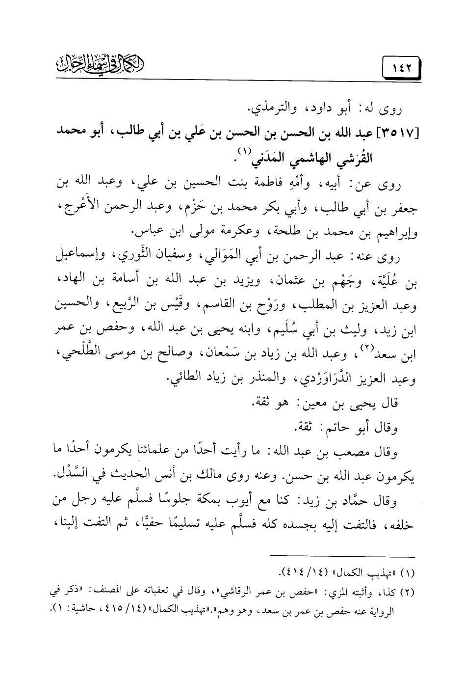 [٣٥١٧] عبد الله بن الحسن بن الحسن بن عَلي بن أبي طالب، أبو محمد القُرَشي الهاشمي المَدَني (¬١).