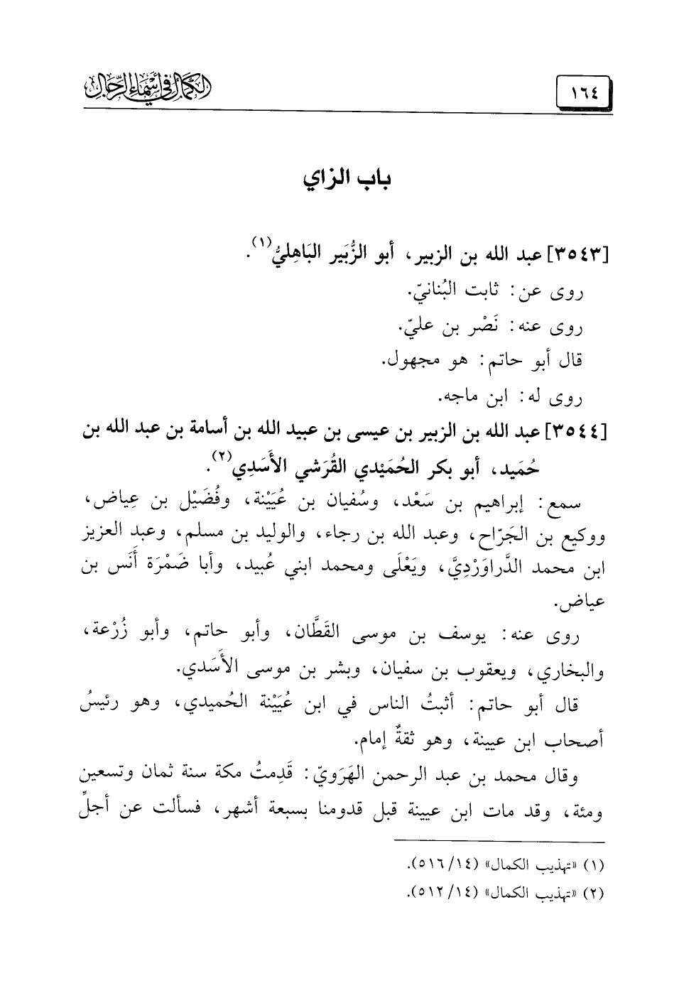 [٣٥٤٤] عبد الله بن الزبير بن عيسى بن عبيد الله بن أسامة بن عبد الله بن حُمَيد، أبو بكر الحُمَيْدي القُرَشي الأسَدِي (¬٢).