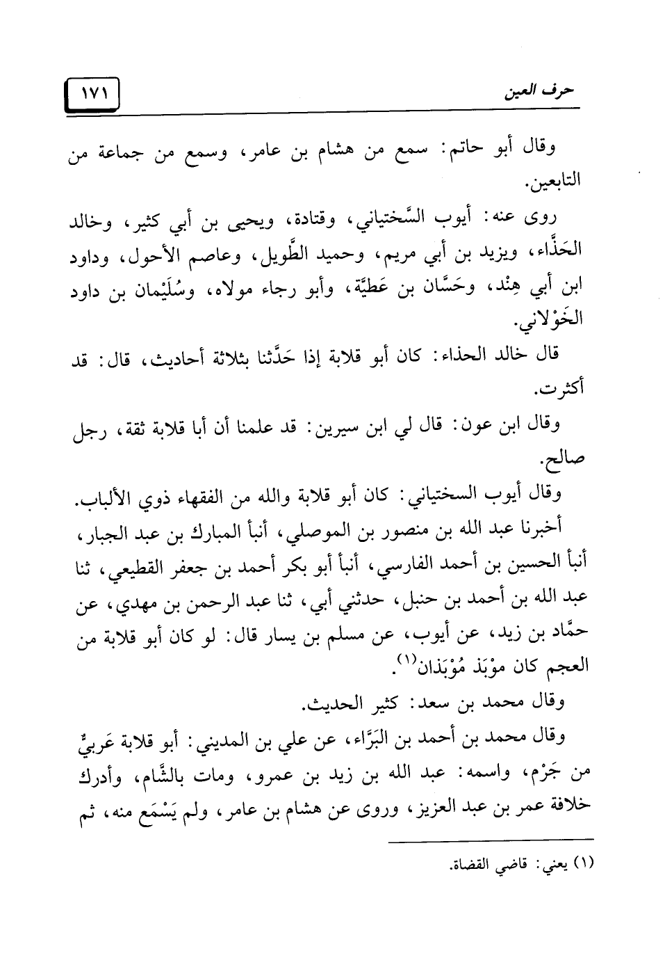 وقال محمد بن أحمد بن البَرَّاء، عن علي بن المديني: أبو قلابة عَربيّ من جَرْم، واسمه: عبد الله بن زيد بن عمرو، ومات بالشَّام، وأدرك خلافة عمر بن عبد العزيز، وروى عن هشام بن عامر، ولم يَسْمَع منه، ثم