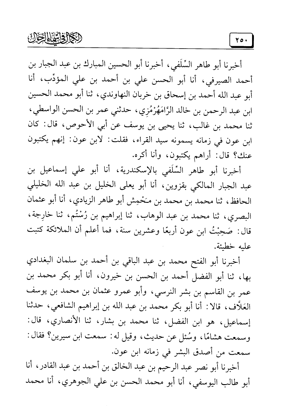 أخبرنا أبو طاهر السِّلَفي، أخبرنا أبو الحسين المبارك بن عبد الجبار بن أحمد الصيرفي، أنا أبو الحسن علي بن أحمد بن علي المؤدِّب، أنا أبو عبد الله أحمد بن إسحاق بن خربان النهاوندي، ثنا أبو محمد الحسين ابن عبد الرحمن بن خالد الرَّامَهُرْمُزِي، حدثني عمر بن الحسن الواسطي، ثنا محمد بن غالب، ثنا يحيى بن يوسف عن أبي الأحوص، قال: كان ابن عون في زمانه يسمونه سيد القراء، فقلت: لابن عون: إنهم يكتبون عنك؟ قال: أراهم يكتبون، وأنا أكره.