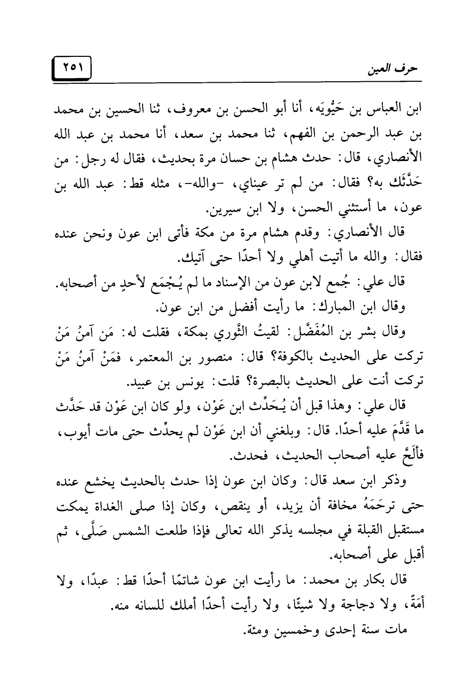 ابن العباس بن حَيُّويَه، أنا أبو الحسن بن معروف، ثنا الحسين بن محمد بن عبد الرحمن بن الفهم، ثنا محمد بن سَعْد، أنا محمد بن عبد الله الأنصاري، قال: حدث هشام بن حسان مرة بحديث، فقال له رجل: من حَدَّثَك به؟ فقال: من لم تر عيناي، -والله-، مثله قط: عبد الله بن عون، ما أستثني الحسن، ولا ابن سيرين.