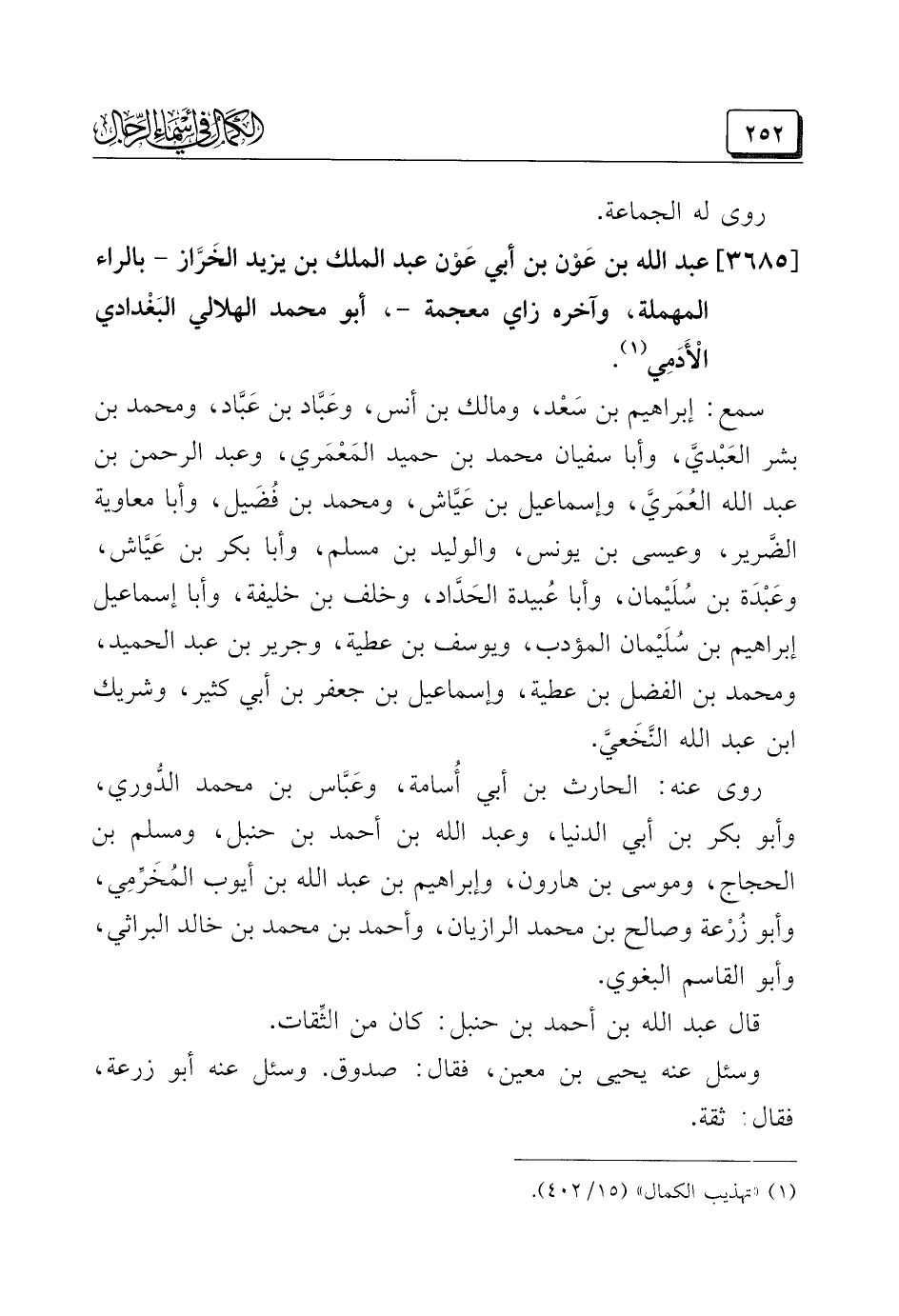 [٣٦٨٥] عبد الله بن عَوْن بن أبي عَوْن عبد الملك بن يزيد الخَرَّاز -بالراء المهملة، وآخره زاي معجمة-، أبو محمد الهلالي البَغْدادي الْأَدَمِي (¬١).