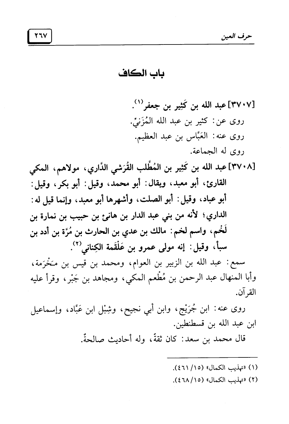 [٣٧٠٨] عبد الله بن كَثِير بن المُطَّلب القُرَشي الدَّاري، مولاهم، المكي القارئ، أبو معبد، ويقال: أبو محمد، وقيل: أبو بكر، وقيل: أبو عباد، وقيل: أبو الصلت، وأشهرها أبو معبد، وإنما قيل له: الداري؛ لأنه من بني عبد الدار بن هانئ بن حبيب بن نمارة بن لَخْم، واسم لخم: مالك بن عدي بن الحارث بن مُرَّة بن أدد بن سبأ، وقيل: إنه مولي عمرو بن عَلْقَمة الكِناني (¬٢).