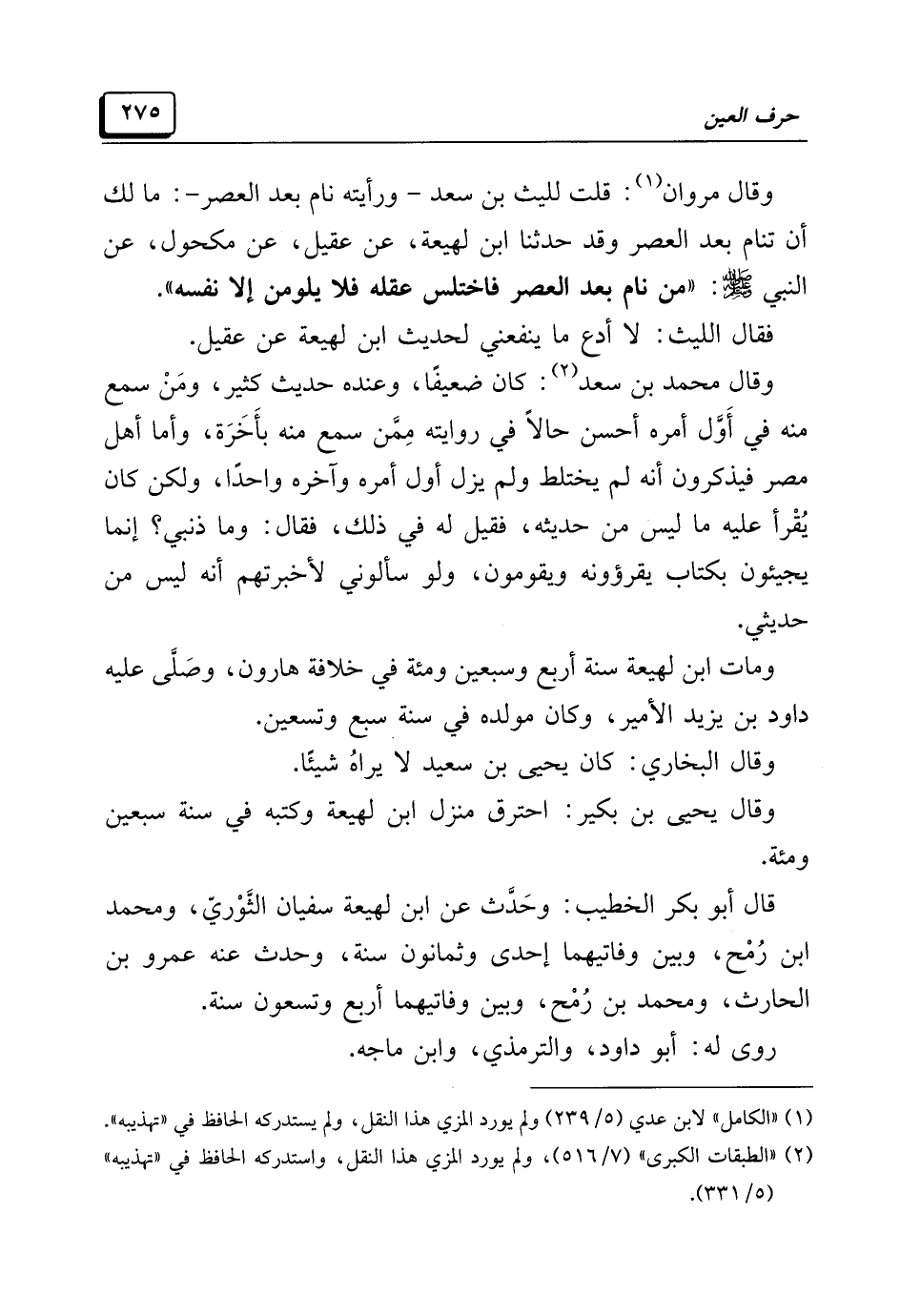 وقال مَرْوان (¬١): قلت لليث بن سعد -ورأيته نام بعد العصر-: ما لك أن تنام بعد العصر وقد حدَّثنا ابن لَهِيعَة، عن عَقِيل، عن مكحول، عن النَّبِيّ -صَلَّى اللهُ عَلَيْهِ وَسَلَّمَ-: "من نام بعد العصر فاختلس عقله فلا يلومن إلَّا نفسه".
