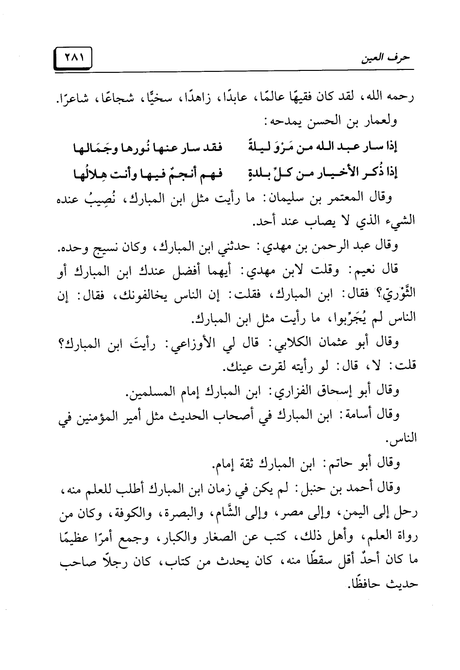وقال أحمد بن حَنْبَل: لم يكن في زمان ابن المُبَارَك أطلب للعلم منه، رحل إلى اليمن، وإلى مصر، وإلى الشَّام، والبصرة، والكوفة، وكان من رواة العلم، وأهل ذلك، كتب عن الصغار والكبار، وجمع أمرًا عظيمًا ما كان أحدٌ أقل سقطًا منه، كان يحدِّث من كتاب، كان رجلًا صاحب حديث حافظًا.