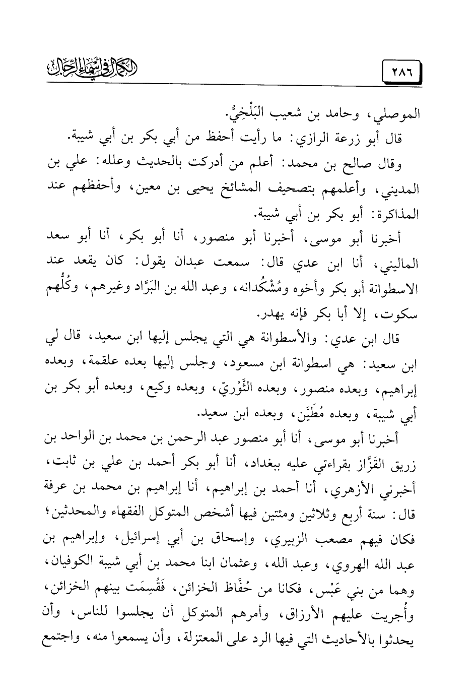 أخبرنا أبو موسى، أنا أبو منصور عبد الرحمن بن محمد بن الواحد بن زريق القَزَّاز بقراءتي عليه ببغداد، أنا أبو بكر أحمد بن عليّ بن ثابت، أخبرني الأَزْهَرِيُّ، أنا أحمد بن إبراهيم، أنا إبراهيم بن محمد بن عَرَفَة قال: سنة أربع وثلاثين ومئتين فيها أشخص المتوكِّل الفقهاء والمحدثين؛ فكان فيهم مصعب الزُّبَيْرِي، وإسحاق بن أبي إسرائيل، وإبراهيم بن عبد الله الهَرَوي، وعبد الله، وعثمان ابنا محمد بن أبي شَيْبَة الكوفيان، وهما من بني عَبْس، فكانا من حُفَّاظ الخزائن، فَقُسِمَت بينهم الخزائن، وأُجريت عليهم الأرزاق، وأمرهم المتوكِّل أن يجلسوا للناس، وأن يحدثوا بالأحاديث الَّتي فيها الرَّدُّ على المعتزلة، وأن يسمعوا منه، واجتمع