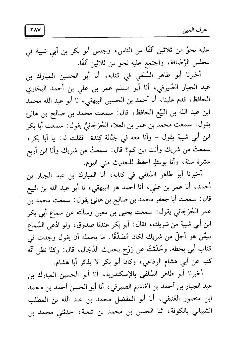 أخبرنا أبو طاهر السِّلَفِي في كتابه، أنا المُبَارَك بن عبد الجبَّار بن أحمد، أنا عمر بن عليّ، أنا أحمد هو البيهقي، نا أبو عبد الله بن البيع قال: سمعت أبا جعفر محمد بن صالح بن هانئ يقول: سمعت محمد بن عمر الجُرْجَاني يقول: سمعت يحيى بن مَعِين وسألته عن سماع أبي بكر ابن أبي شَيْبَة من شَرِيك، فقال: أبو بكر عندنا صدوق، ولو ادَّعى السَّماع مِمَّن هو أجلّ من شَرِيك لكان مُصَدَّقًا. ما يحمله أن يقول وجدت في كتاب أبي بخطه. وحُدّثتُ عن رَوْح بحديث الدَّجَّال، قال: وكنّا نظن أنَّه كتبه عن أبي هشام الرفاعي، وكان أبو بكر لا يذكر أبا هشام.