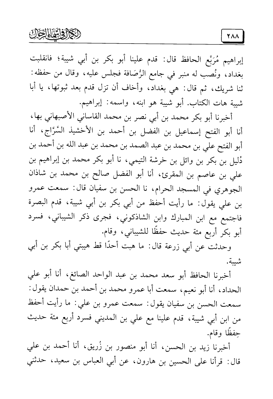 إبراهيم مُرَبَّع الحافظ قال: قدم علينا أبو بكر بن أبي شَيْبَة؛ فانقلبت بغداد، ونُصب له منبر في جامع الرُّصَافة فجلس عليه، وقال من حفظه: ثنا شَرِيك، ثمَّ قال: هي بغداد، وأخاف أن تزل قدم بعد ثبوتها، يا أبا شَيْبَة هات الكتاب. أبو شَيْبَة هو ابنه، واسمه: إبراهيم.