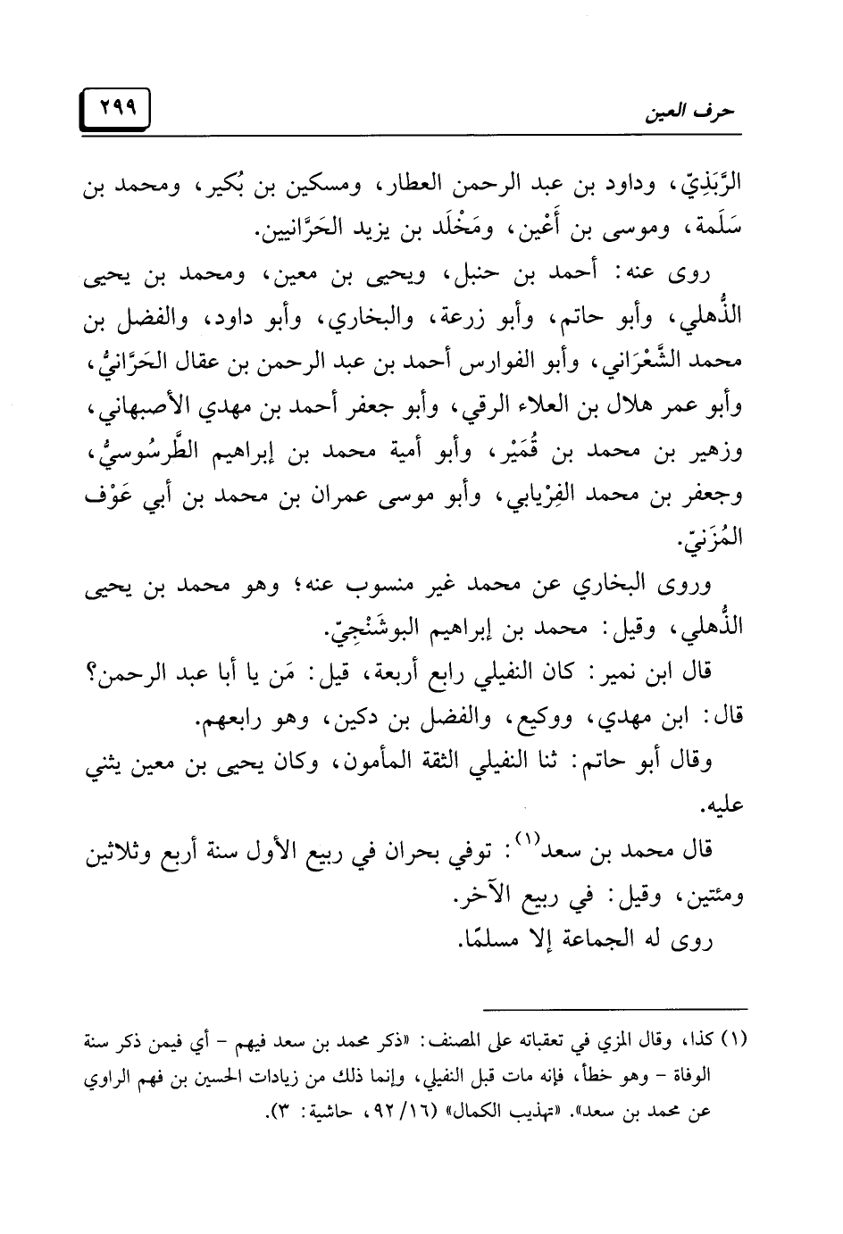 (¬١) كذا، وقال المزي في تعقباته على المصنف: "ذكر محمد بن سعد فيهم -أي فيمن ذكر سنة الوفاة- وهو خطأ، فإنه مات قبل النفيلي، وإنما ذلك من زيادات الحسين بن فهم الراوي عن محمد بن سعد". "تهذيب الكمال" (١٦/ ٩٢، حاشية: ٣).