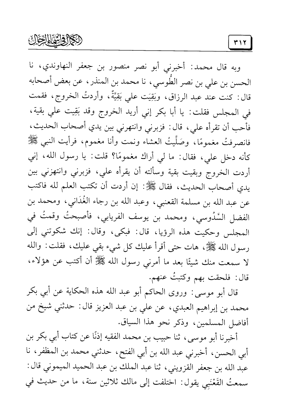 وبه قال محمد: أخبرني أبو نصر منصور بن جعفر النهاوندي، نا الحسن بن علي بن نصر الطُّوسي، نا محمد بن المنذر، عن بعض أصحابه قال: كنت عند عبد الرزاق، وبَقِيَت علىّ بَقِيَّةٌ، وأردتُ الخروج، فقمت في المجلس فقلت: يا أبا بكر إني أريد الخروج وقد بَقِيت على بقية، فأحب أن تقرأه عليّ، قال: فزبرني وانتهرني بين يدي أصحاب الحديث، فانصرفتُ مغمومًا، وصَلَّيتُ العشاء ونمت وأنا مغموم، فرأيت النبي -صَلَّى اللهُ عَلَيْهِ وَسَلَّمَ- كأنه دخل علي، فقال: ما لي أراك مغمومًا؟ قلت: يا رسول الله، إني أردت الخروج وبقيت بقية وسألته أن يقرأه علي، فزبرني وانتهزني بين يدي أصحاب الحديث، فقال -صَلَّى اللهُ عَلَيْهِ وَسَلَّمَ-: إن أردت أن تكتب العلم لله فاكتب عن عبد الله بن مسلمة القعنبي، وعبد الله بن رجاء الغُدَاني، ومحمد بن الفضل السُّدُوسي، ومحمد بن يوسف الفريابي، فأصبحتُ وقمتُ في المجلس وحكيت هذه الرؤيا، قال: فبكى، وقال: إنك شكوتني إلى رسول الله -صَلَّى اللهُ عَلَيْهِ وَسَلَّمَ-، هات حتى أقرأ عليك كل شيء بقي عليك، فقلت: والله لا سمعت منك شيئًا بعد ما أمرني رسول الله -صَلَّى اللهُ عَلَيْهِ وَسَلَّمَ- أن أكتب عن هؤلاء، قال: فلحقت بهم وكتبتُ عنهم.
