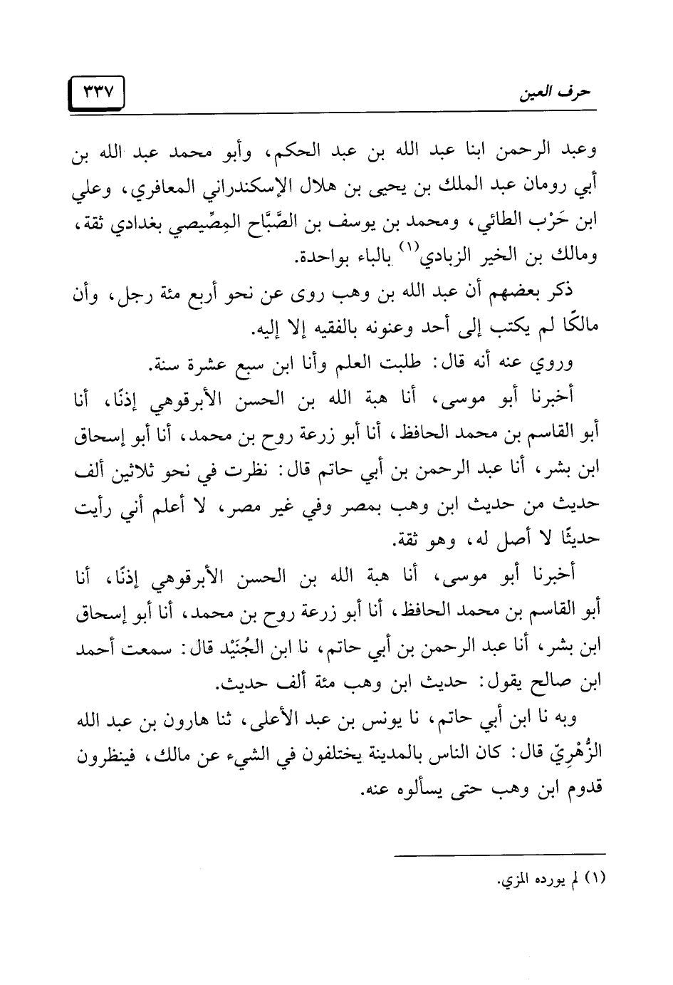 وبه نا ابن أبي حاتم، نا يونس بن عبد الأعلى، ثنا هارون بن عبد الله الزُّهْرِيّ قال: كان الناس بالمدينة يختلفون في الشيء عن مالك، فينظرون قدوم ابن وهب حتى يسألوه عنه.