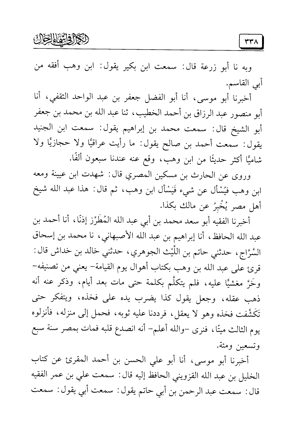 أخبرنا أبو موسى، أنا أبو الفضل جعفر بن عبد الواحد الثقفي، أنا أبو منصور عبد الرزاق بن أحمد الخطيب، ثنا عبد الله بن محمد بن جعفر أبو الشيخ قال: سمعت محمد بن إبراهيم يقول: سمعت ابن الجنيد يقول: سمعت أحمد بن صالح يقول: ما رأيت عراقيًّا ولا حجازيًّا ولا شاميًّا أكثر حديثًا من ابن وهب، وقع عنه عندنا سبعون ألفًا.