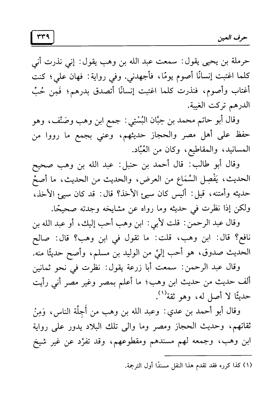 حرملة بن يحيى يقول: سمعت عبد الله بن وهب يقول: إني نذرت أني كلما اغتبت إنسانًا أصوم يومًا، فأجهدني. وفي رواية: فهان علي؛ كنت أغتاب وأصوم، فنذرت كلما اغتبت إنسانًا أتصدق بدرهم؛ فَمِن حُبِّ الدرهم تركت الغيبة.