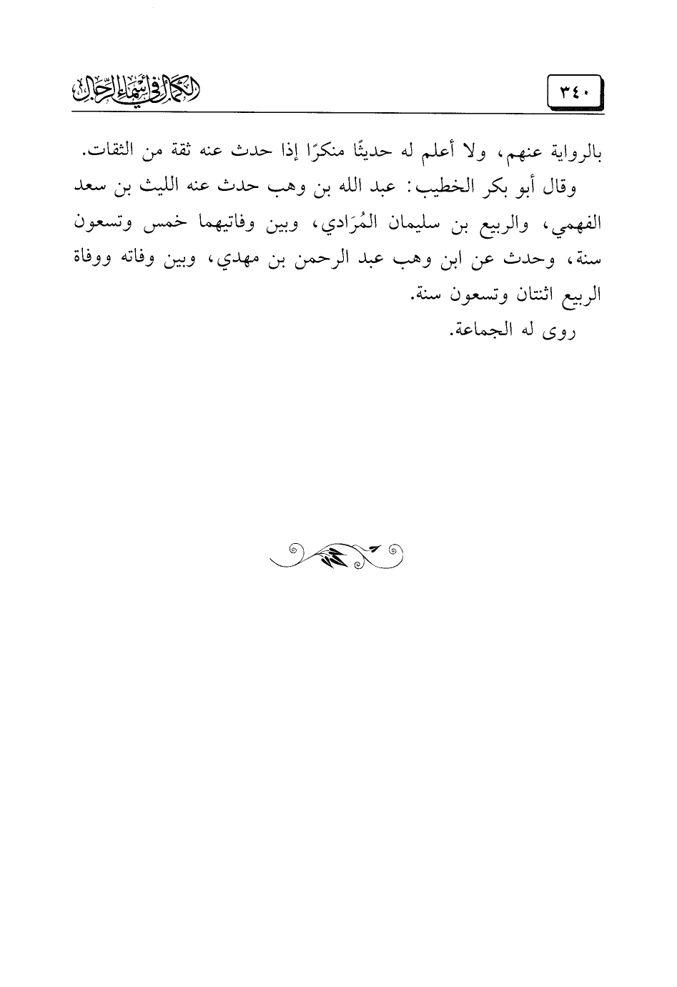 وقال أبو بكر الخطيب: عبد الله بن وهب حدث عنه الليث بن سعد الفهمي، والربيع بن سليمان المُرَادي، وبين وفاتيهما خمس وتسعون سنة، وحدث عن ابن وهب عبد الرحمن بن مهدي، وبين وفاته ووفاة الربيع اثنتان وتسعون سنة.