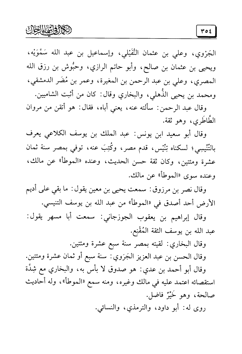 وقال إبراهيم بن يعقوب الجوزجاني: سمعت أبا مسهر يقول: عبد الله بن يوسف الثقة المُقْنِع.