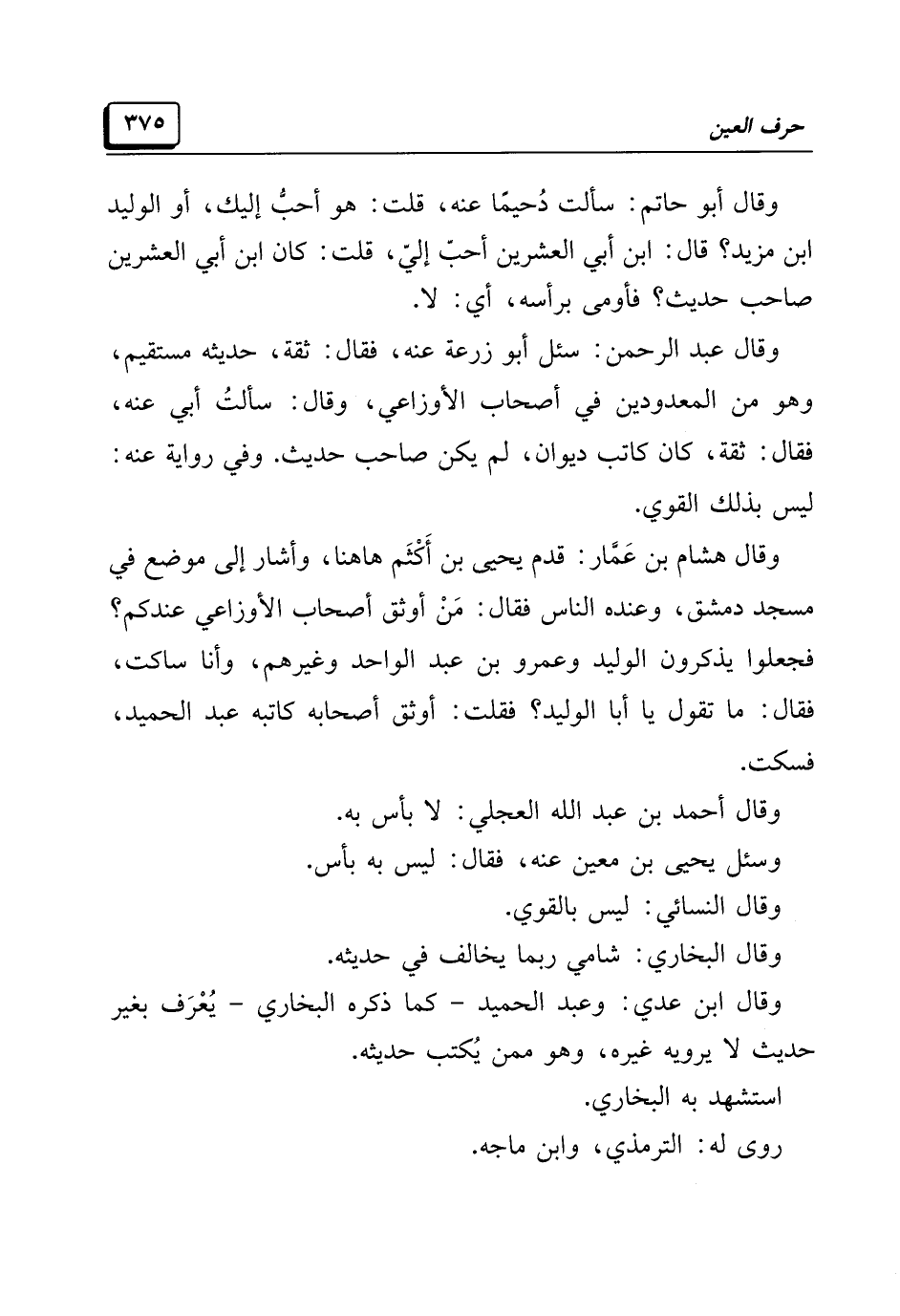 وقال عبد الرحمن: سئل أبو زرعة عنه، فقال: ثقة، حديثه مستقيم، وهو من المعدودين في أصحاب الأوزاعي، وقال: سألتُ أبي عنه، فقال: ثقة، كان كاتب ديوان، لم يكن صاحب حديث. وفي رواية عنه: ليس بذلك القوي.