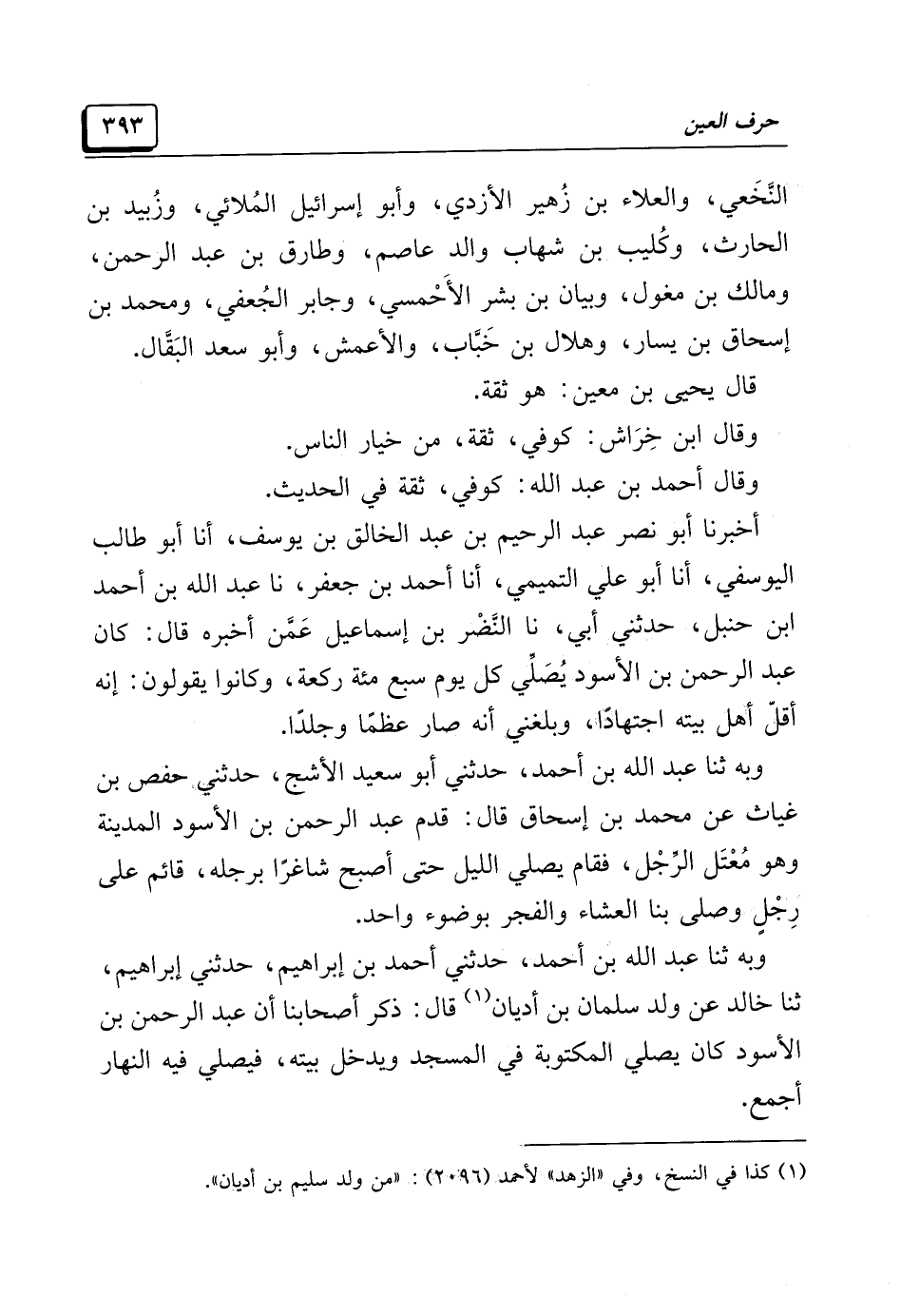 وبه ثنا عبد الله بن أحمد، حدثني أبو سعيد الأشج، حدثني حفص بن غياث عن محمد بن إسحاق قال: قدم عبد الرحمن بن الأسود المدينة وهو مُعْتَل الرِّجْل، فقام يصلي الليل حتى أصبح شاغرًا برجله، قائم على رِجْلٍ وصلي بنا العشاء والفجر بوضوء واحد.