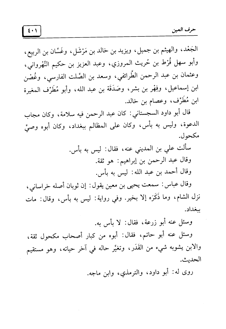 وقال عباس: سمعت يحيى بن معين يقول: إن ثوبان أصله خراساني، نزل الشام، وما ذَكَرَه إلا بخير. وفي رواية: ليس به بأس، وقال: مات ببغداد.