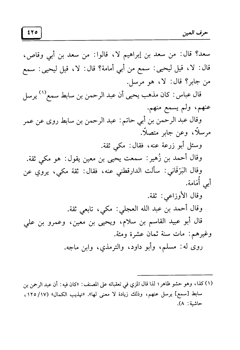 (¬١) كذا، وهو حشو ظاهر؛ لذا قال المزي في تعقباته على المصنف: "كان فيه: أن عبد الرحمن بن سابط [سمع] يرسل عنهم، وذلك زيادة لا معنى لها". "تهذيب الكمال" (١٧/ ١٢٥، حاشية: ٨).