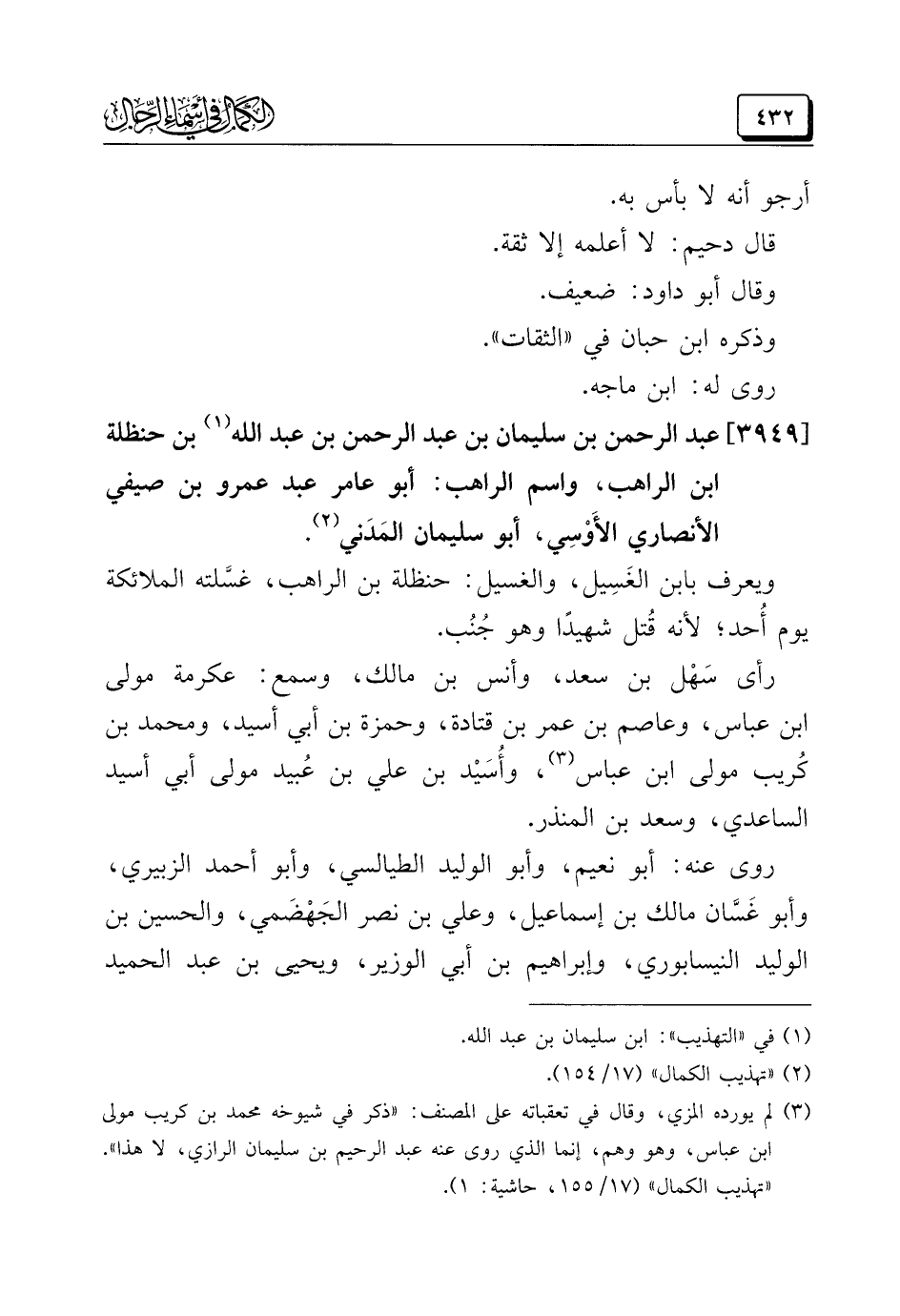 [٣٩٤٩] عبد الرحمن بن سليمان بن عبد الرحمن بن عبد الله (¬١) بن حنظلة ابن الراهب، واسم الراهب: أبو عامر عبد عمرو بن صيفي الأنصاري الأَوْسِي، أبو سليمان المَدَني (¬٢).