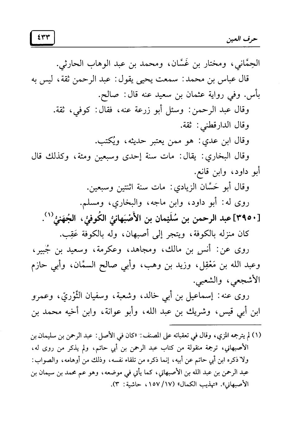 (¬١) لم يترجمه المزي، وقال في تعقباته على المصنف: "كان في الأصل: عبد الرحمن بن سليمان بن الأصبهاني، ترجمة منقولة من كتاب عبد الرحمن بن أبي حاتم، ولم يذكر من روى له، ولا ذكره ابن أبي حاتم عن أبيه، إنما ذكره من تلقاء نفسه، وذلك من أوهامه، والصواب: عبد الرحمن بن عبد الله بن الأصبهاني، كما يأتي في موضعه، وهو عم محمد بن سليمان بن الأصبهاني". "تهذيب الكمال" (١٧/ ١٥٧، حاشية: ٣).