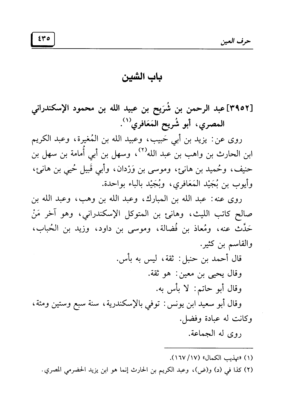 [٣٩٥٢] عبد الرحمن بن شُرَيح بن عبيد الله بن محمود الإسكندراني المصري، أبو شُريح المَعَافري (¬١).