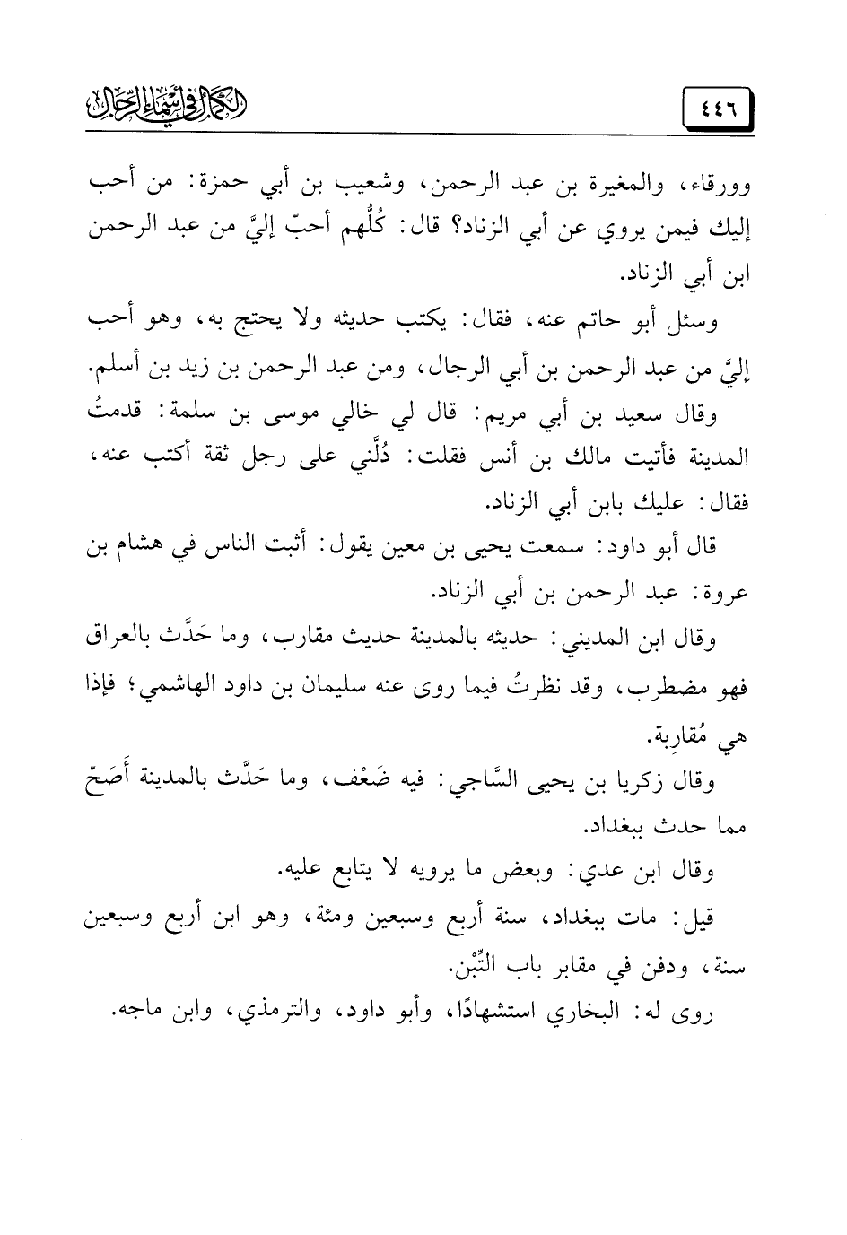 وورقاء، والمغيرة بن عبد الرحمن، وشعيب بن أبي حمزة: من أحب إليك فيمن يروى عن أبي الزناد؟ قال: كُلُّهم أحبّ إليَّ من عبد الرحمن ابن أبي الزناد.