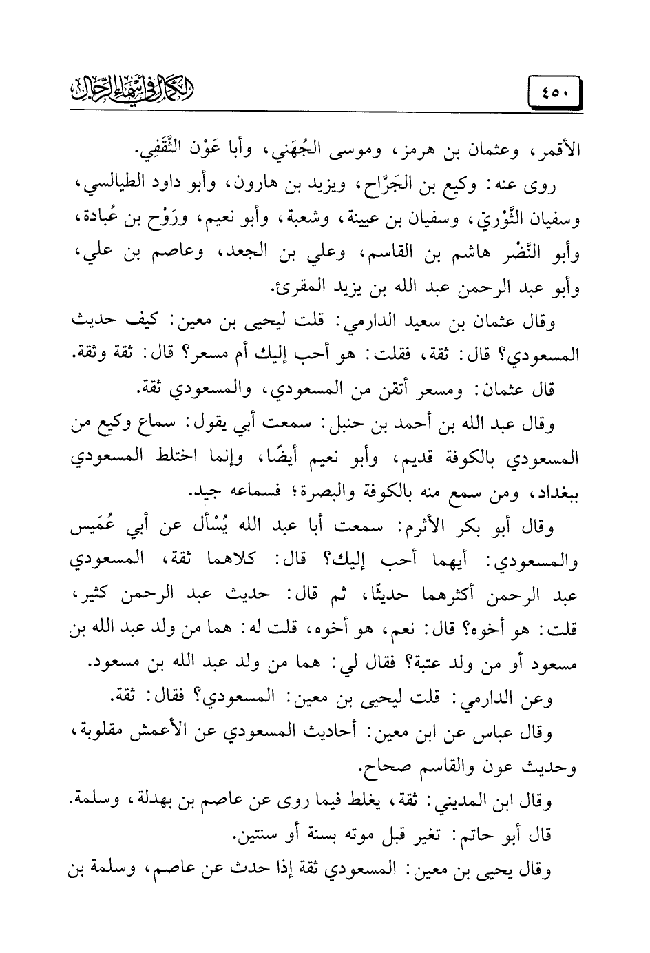 وقال عثمان بن سعيد الدارمي: قلت ليحيى بن معين: كيف حديث المسعودي؟ قال: ثقة، فقلت: هو أحب إليك أم مسعر؟ قال: ثقة وثقة.
