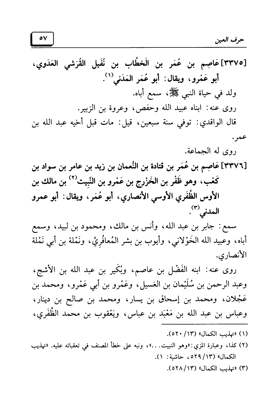 [٣٣٧٥] عَاصِم بن عُمَر بن الخَطَّاب بن نُفَيل القُرَشي العَدَوي، أبو عَمْرو، ويقال: أبو عُمَر المَدَني (¬١).