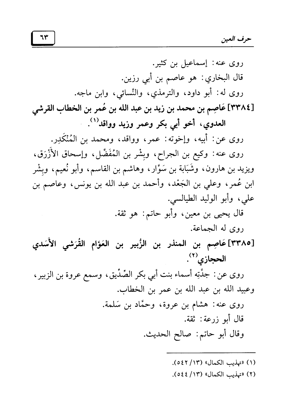 [٣٣٨٤] عَاصِم بن محمد بن زيد بن عبد الله بن عُمر بن الخطاب القرشي العدوي، أخو أبي بكر وعمر وزيد وواقد (¬١).