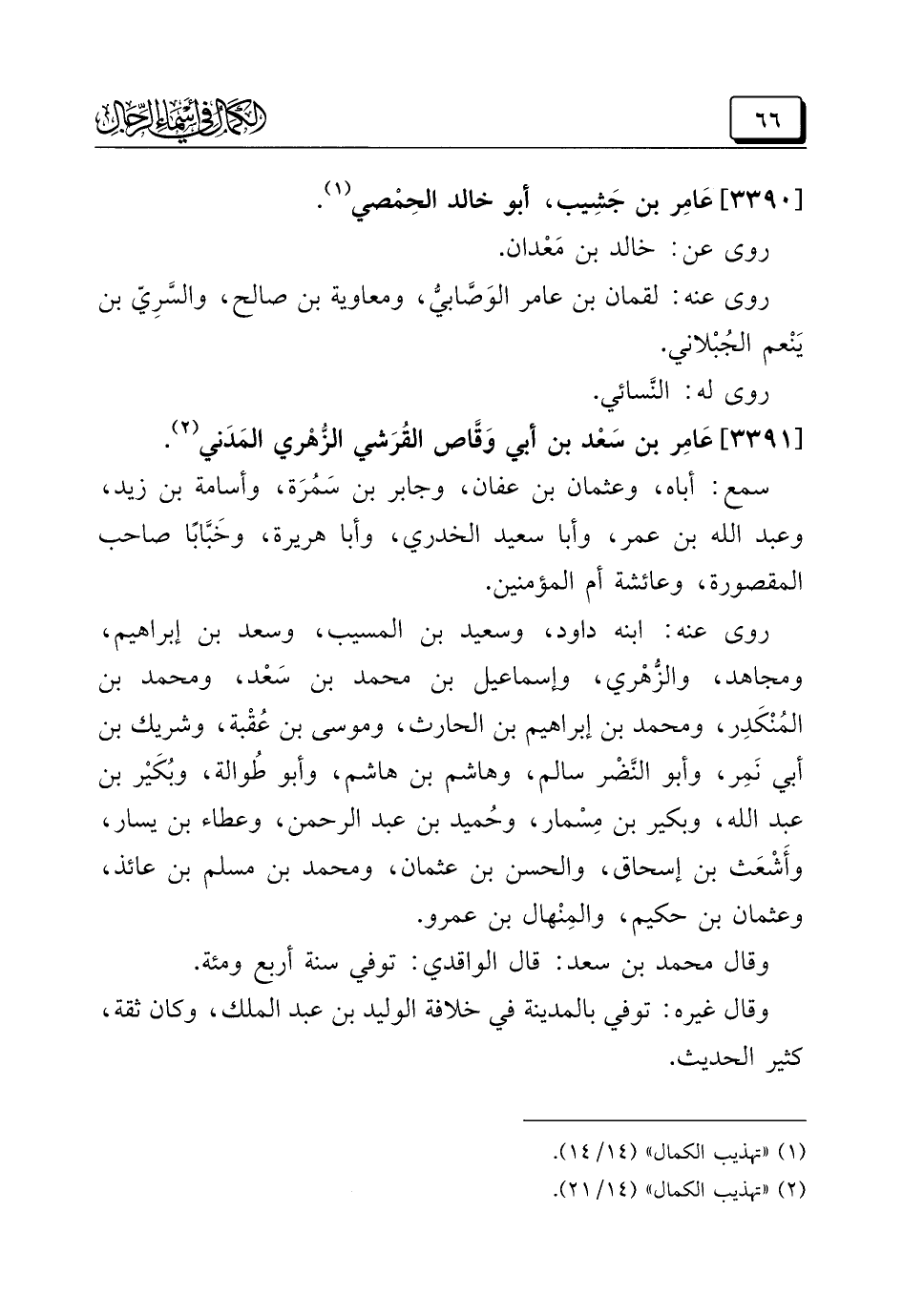 [٣٣٩١] عَامِر بن سَعْد بن أبي وَقَّاص القُرَشي الزُّهْري المَدَني (¬٢).