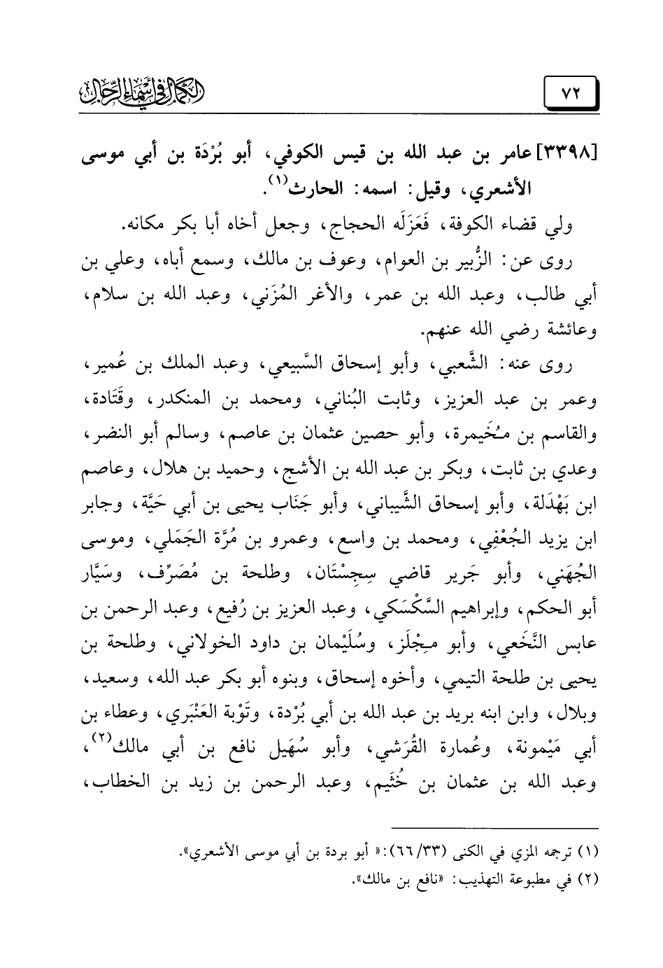[٣٣٩٨] عامر بن عبد الله بن قيس الكوفي، أبو بُرْدَة بن أبي موسى الأشعري، وقيل: اسمه: الحارث (¬١).