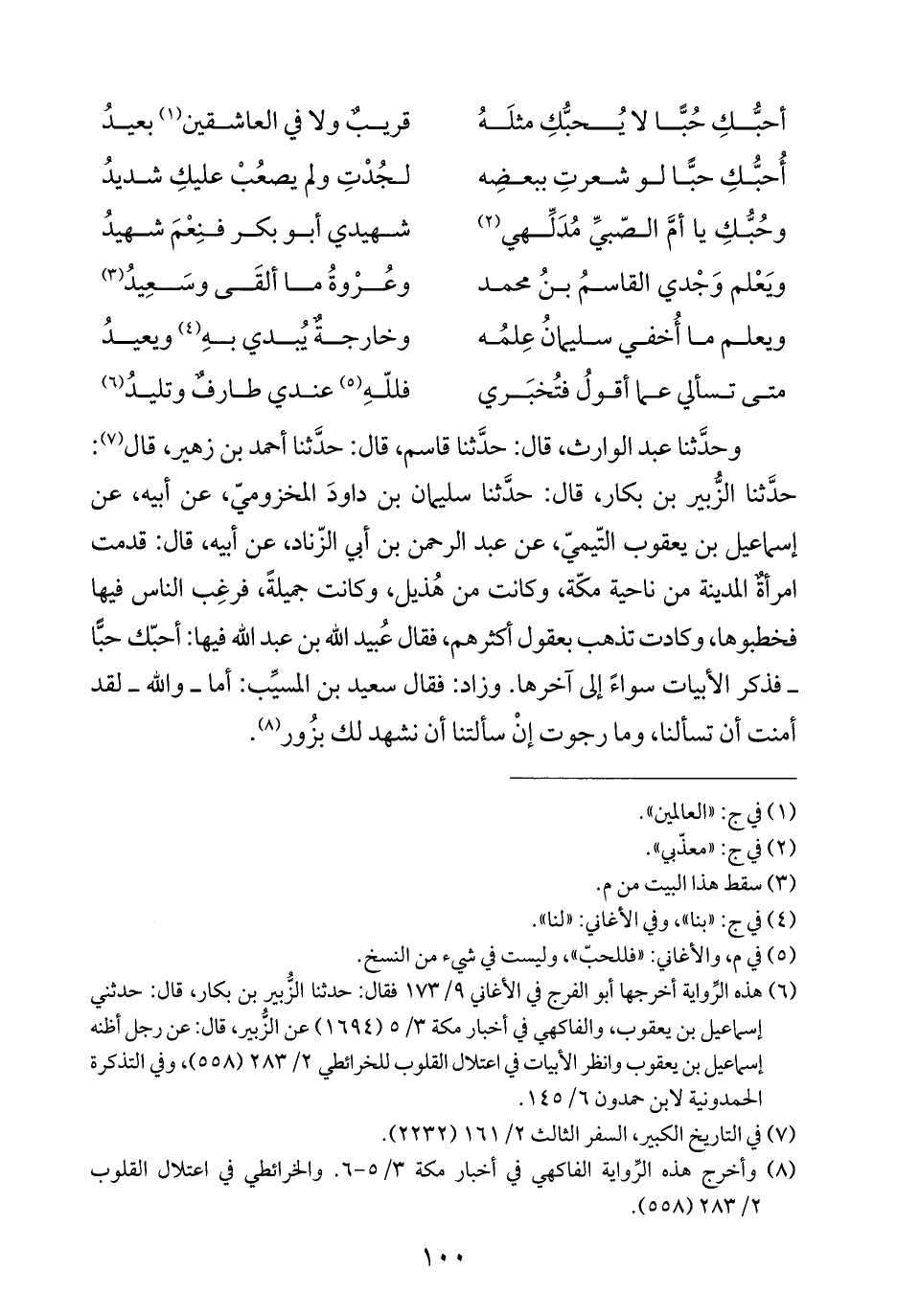 وحدَّثنا عبد الوارث، قال: حدَّثنا قاسم، قال: حدَّثنا أحمد بن زهير، قال (¬٧): حدَّثنا الزُّبير بن بكار، قال: حدَّثنا سليمان بن داودَ المخزوميّ، عن أبيه، عن إسماعيل بن يعقوب التّيميّ، عن عبد الرحمن بن أبي الزّناد، عن أبيه، قال: قدمت امرأةٌ المدينة من ناحية مكّة، وكانت من هُذيل، وكانت جميلةً، فرغِب الناس فيها فخطبوها، وكادت تذهب بعقول أكثرهم، فقال عُبيد الله بن عبد الله فيها: أحبّك حبًّا - فذكر الأبيات سواءً إلى آخرها. وزاد: فقال سعيد بن المسيِّب: أما - والله - لقد أمنت أن تسألنا، وما رجوت إنْ سألتنا أن نشهد لك بزُور (¬٨).