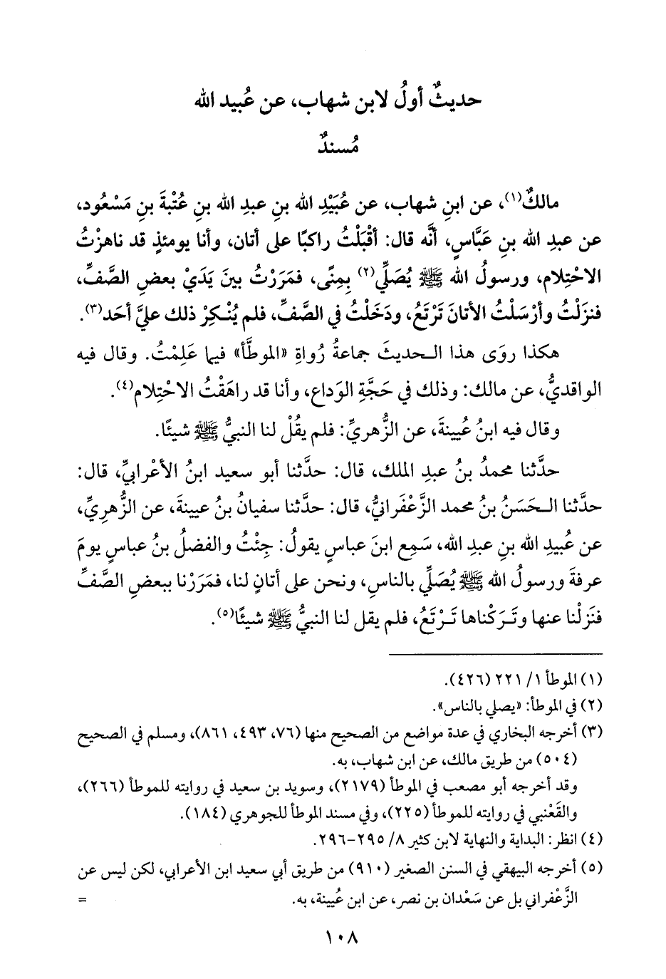 حدَّثنا محمدُ بنُ عبدِ الملك، قال: حدَّثنا أبو سعيد بنُ الأعْرابيِّ، قال: حدَّثنا الحَسَنُ بنُ محمد الزَّعْفَرانيُّ، قال: حدَّثنا سفيانُ بنُ عيينةَ، عن الزُّهرِيِّ، عن عُبيدِ الله بنِ عبدِ الله، سَمِع ابنَ عباسٍ يقولُ: جِئْتُ والفضلُ بنُ عباسٍ يومَ عرفةَ ورسولُ الله - صلى الله عليه وسلم - يُصَلِّي بالناسِ، ونحن على أتانٍ لنا، فمَرَرْنا ببعضِ الصفِّ فنَزلْنا عنها وتَرَكْناها تَرْتَعُ، فلم يقل لنا النبيُّ - صلى الله عليه وسلم - شيئًا (¬٥).