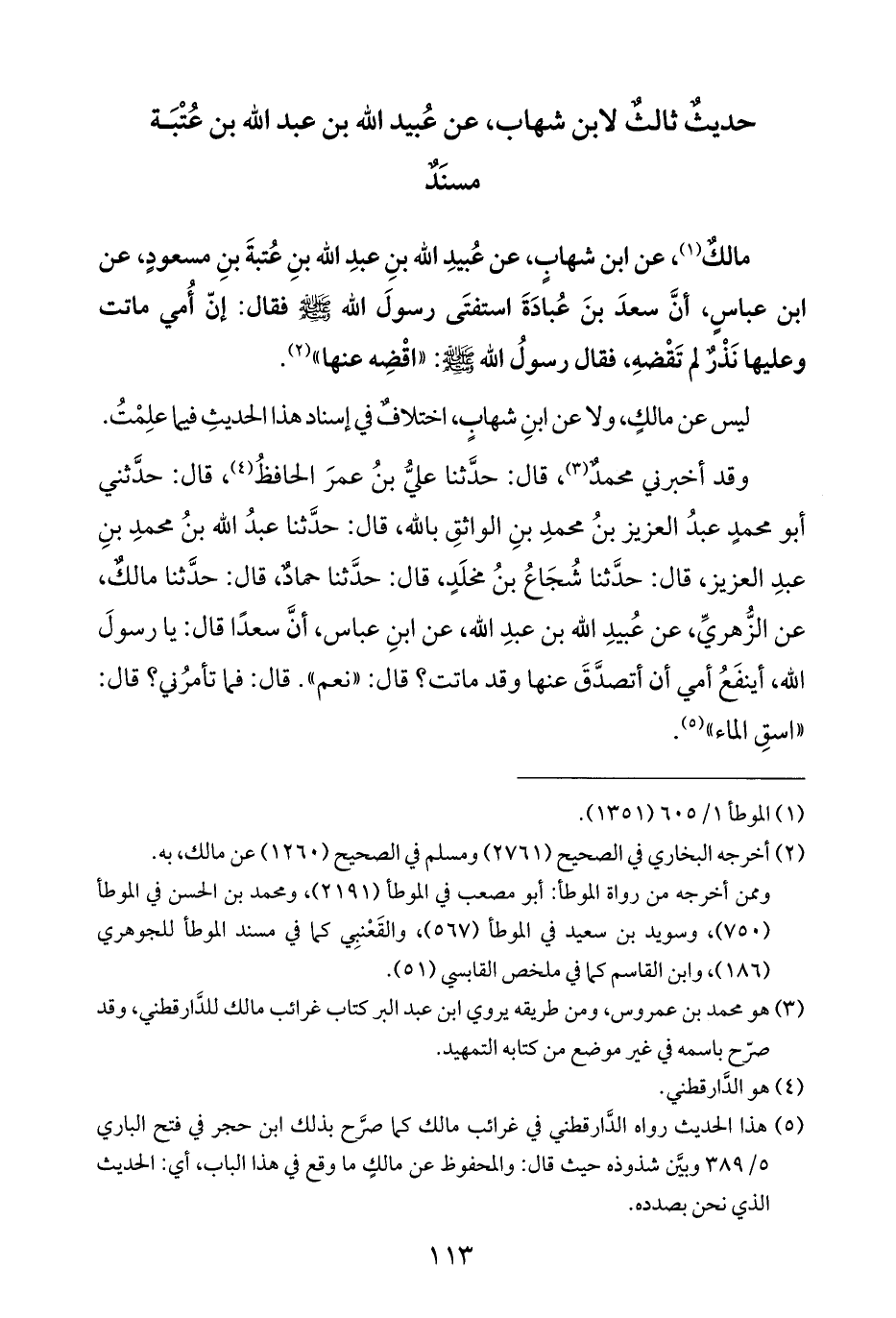 مالكٌ (¬١)، عن ابن شهابٍ، عن عُبيدِ الله بنِ عبدِ الله بنِ عُتبةَ بنِ مسعودٍ، عن ابن عباسٍ، أنَّ سعدَ بنَ عُبادَةَ استفتَى رسولَ الله - صلى الله عليه وسلم - فقال: إنّ أُمي ماتت وعليها نَذْرٌ لم تَقْضهِ، فقال رسولُ الله - صلى الله عليه وسلم -: "اقْضِه عنها" (¬٢).