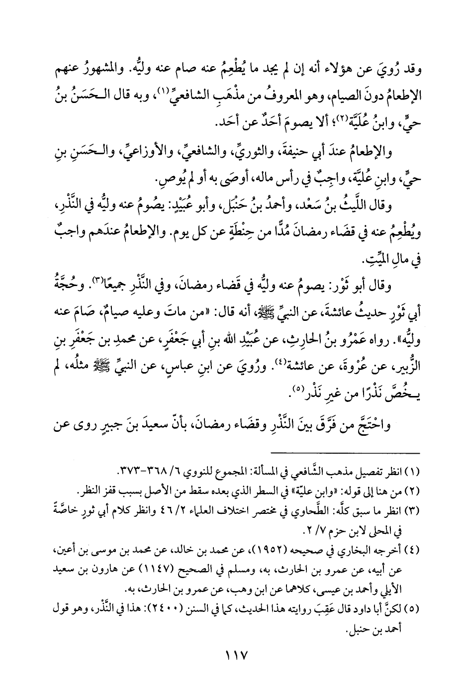 وقال اللَّيثُ بنُ سَعْد، وأحمدُ بنُ حَنْبَل، وأبو عُبَيْدٍ: يصُومُ عنه وليُّه في النَّذْرِ، ويُطْعِمُ عنه في قضَاء رمضانَ مُدًّا من حِنْطَةٍ عن كل يوم. والإطعامُ عندَهم واجبٌ في مالِ الميِّتِ.