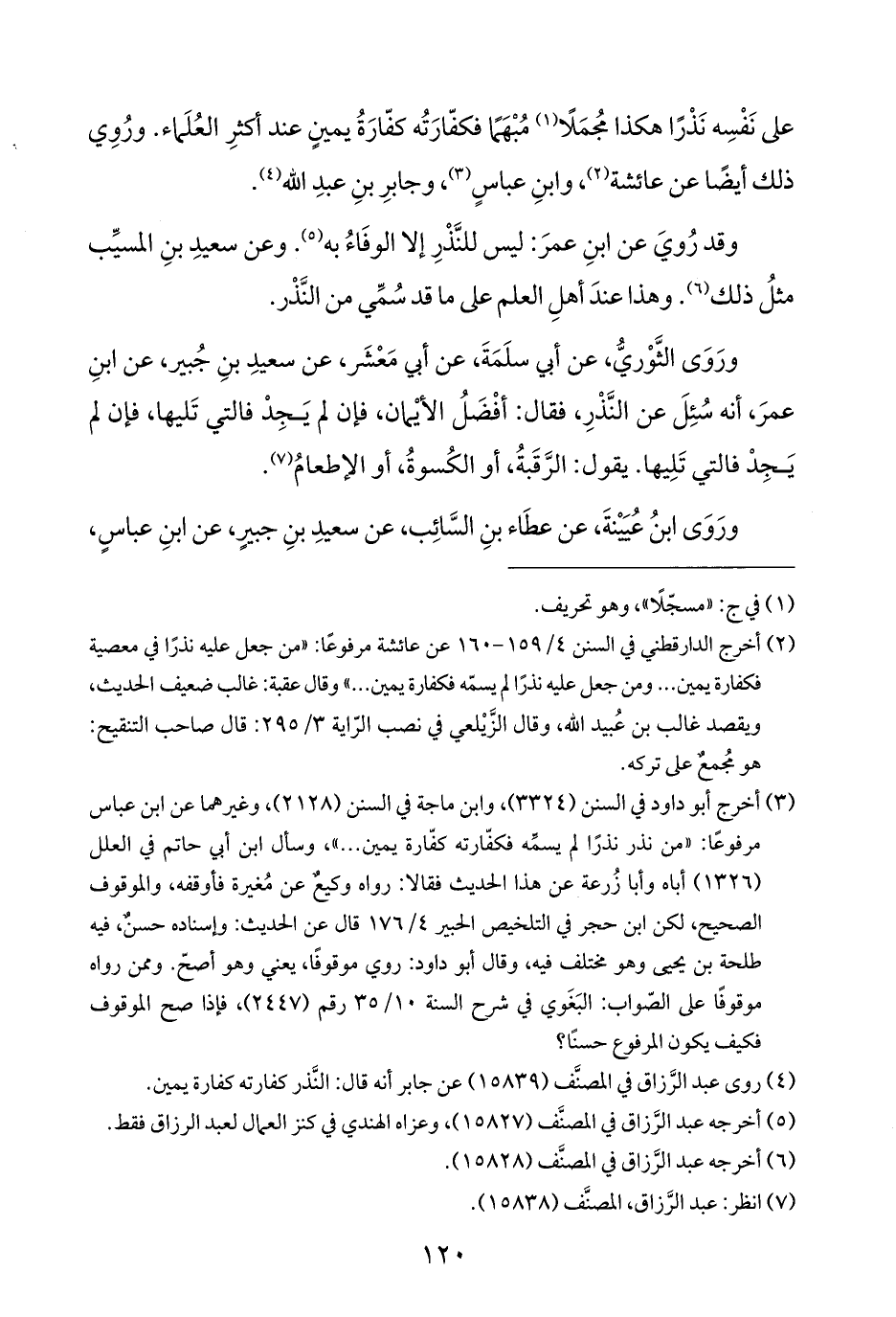 (¬٢) أخرج الدارقطني في السنن ٤/ ١٥٩ - ١٦٠ عن عائشة مرفوعًا: "من جعل عليه نذرًا في معصية فكفارة يمين ... ومن جعل عليه نذرًا لم يسمّه فكفارة يمين ... " وقال عقبة: غالب ضعيف الحديث، ويقصد غالب بن عُبيد الله، وقال الزَّيْلعي في نصب الرّاية ٣/ ٢٩٥: قال صاحب التنقيح: هو مُجمعٌ على تركه.