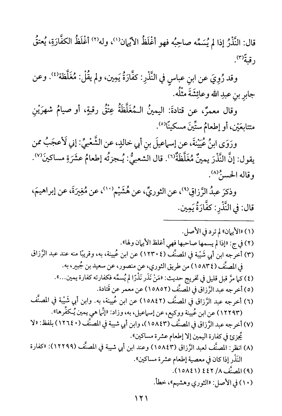 (¬٨) انظر: المصنَّف لعبد الرَّزاق (١٥٨٤٣) وعند ابن أبي شيبة في المصنَّف (١٢٢٩٩): "كفارة النَّذْر إذا كان في معصية إطعام عشرة مساكين".