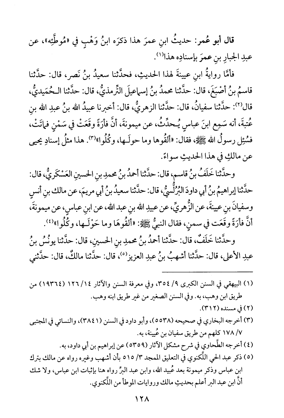 فأمَّا روايةُ ابنِ عيينةَ لهذا الحديثِ، فحدَّثنا سعيدُ بنُ نَصر، قال: حدَّثنا قاسمُ بنُ أصْبَغَ، قال: حدَّثنا محمدُ بنُ إسماعيلَ التِّرمذيُّ، قال: حدَّثنا الحُمَيديُّ، قال (¬٢): حدَّثنا سفيانُ، قال: حدَّثنا الزهريُّ، قال: أخبرنا عبيدُ الله بنُ عبدٍ الله بنِ عُتبةَ، أنه سَمِع ابنَ عباس يُحدِّثُ، عن ميمونةَ، أنَّ فأرَةً وقَعَتْ في سَمْنٍ فماتَتْ، فسُئِل رسولُ الله - صلى الله عليه وسلم -، فقال: "ألقُوها وما حولَها، وكُلُوا" (¬٣). هذا مثلُ إسنادِ يحيى عن مالكِ في هذا الحديثِ سواءً.