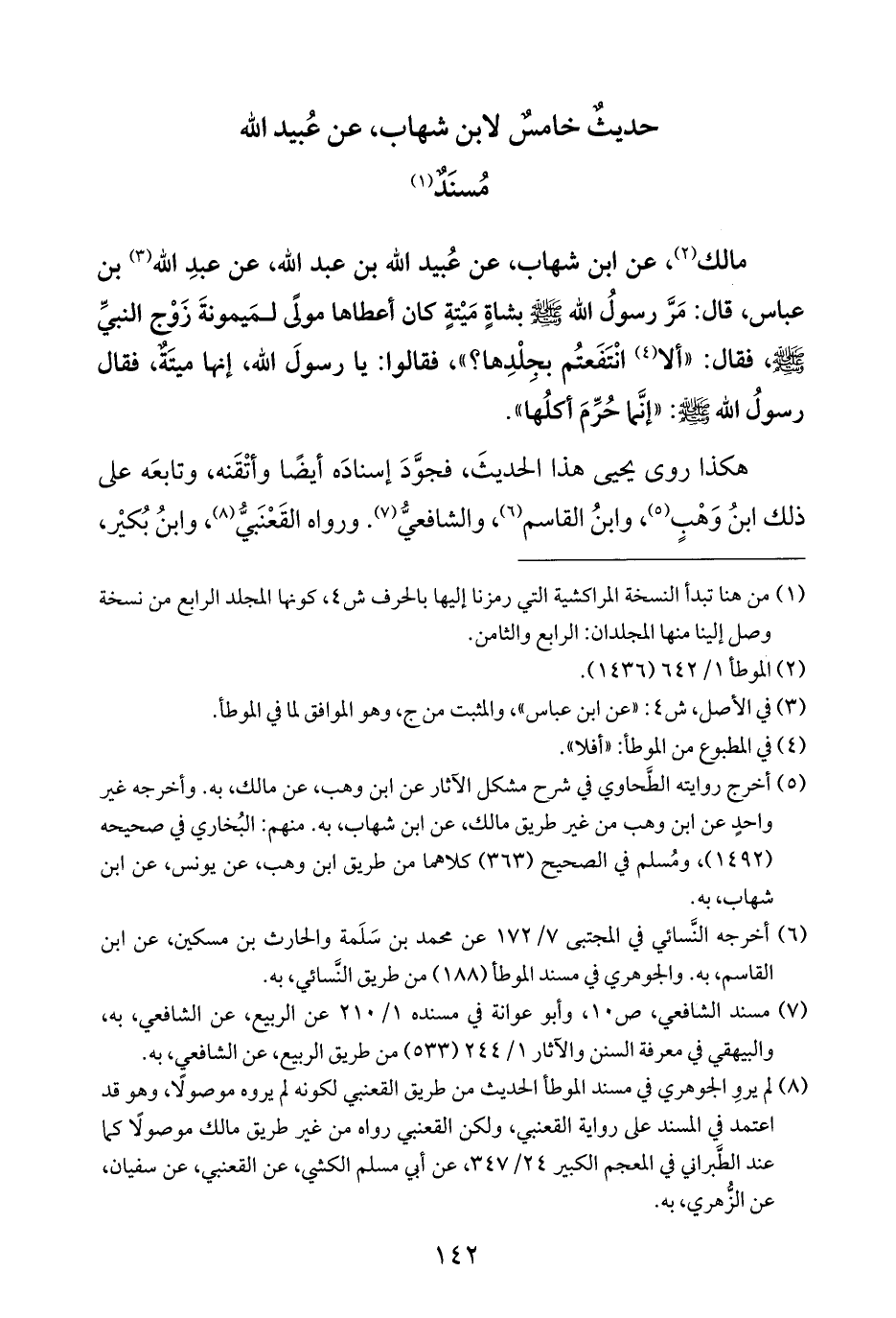 (¬٨) لم يروِ الجوهري في مسند الموطأ الحديث من طريق القعنبي لكونه لم يروه موصولًا، وهو قد اعتمد في المسند على رواية القعنبي، ولكن القعنبي رواه من غير طريق مالك موصولًا كما عند الطَّبراني في المعجم الكبير ٢٤/ ٣٤٧، عن أبي مسلم الكشي، عن القعنبي، عن سفيان، عن الزُهري، به.
