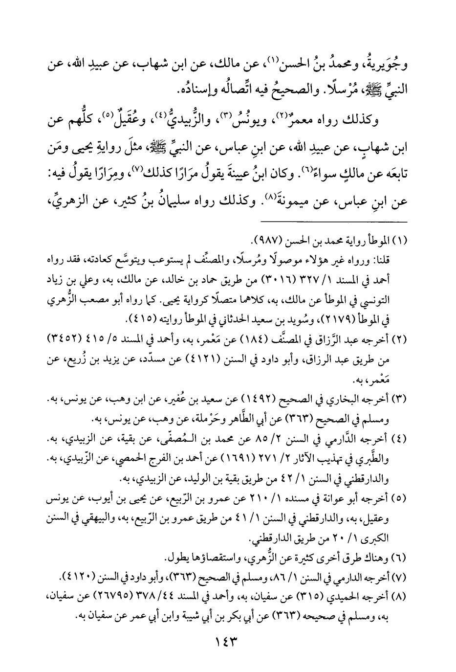 وجُوَيريةُ، ومحمدُ بنُ الحسن (¬١)، عن مالك، عن ابن شهاب، عن عبيدِ الله، عن النبيِّ - صلى الله عليه وسلم -، مُرْسلًا. والصحيحُ فيه اتِّصالُه وإسنادُه.