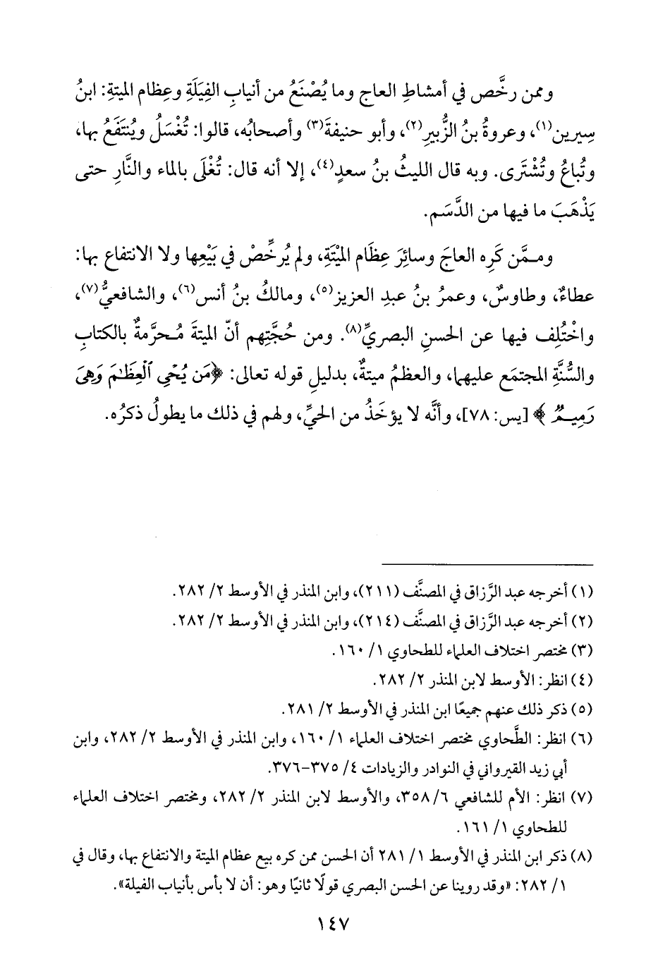 (¬٨) ذكر ابن المنذر في الأوسط ١/ ٢٨١ أن الحسن ممن كره بيع عظام الميتة والانتفاع بها، وقال في ١/ ٢٨٢: "وقد روينا عن الحسن البصري قولًا ثانيًا وهو: أن لا بأس بأنياب الفيلة".