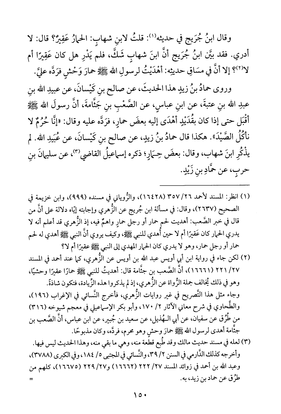 (¬١) انظر: المسند لأحمد ٢٦/ ٣٥٧ (١٦٤٢٨)، والرُّوياني في مسنده (٩٩٩)، وابن خزيمة في الصحيح (٢٦٣٧)، وقال: في مسألة ابن جُريج عن الزُّهري وإجابته إيّاه دلالة على أنَّ من قال في خبر الصَّعب: أهديت لحم حمار أو رجل حمارٍ واهمٌ فيه، إذ الزُّهري قد أعلم أنه لا يدري الحمار كان عَقيرًا أم لا حين أُهدي للنبي - صلى الله عليه وسلم - , وكيف يروي أنَّ النبي - صلى الله عليه وسلم - أهدي له لحم حمار أو رجل حمار، وهو لا يدري كان الحمار المهدي إلى النبي - صلى الله عليه وسلم - عقيرًا أم لا؟