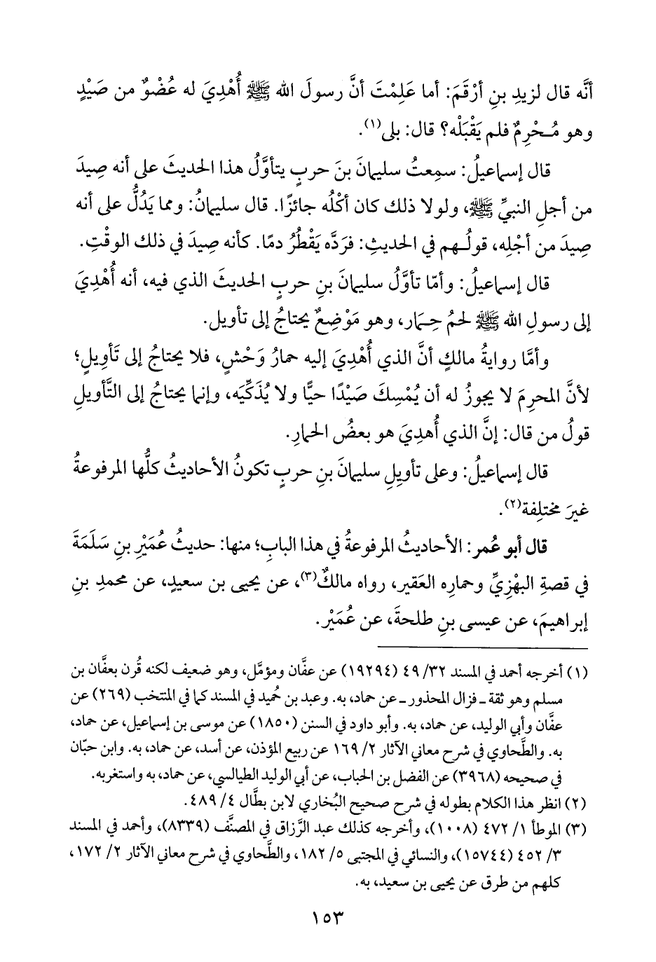 قال إسماعيلُ: وأمّا تأوَّلُ سليمانَ بنِ حربٍ الحديثَ الذي فيه، أنه أُهْدِيَ إلى رسولِ الله - صلى الله عليه وسلم - لحمُ حِمَار، وهو مَوْضِعٌ يحتاجُ إلى تأويل.