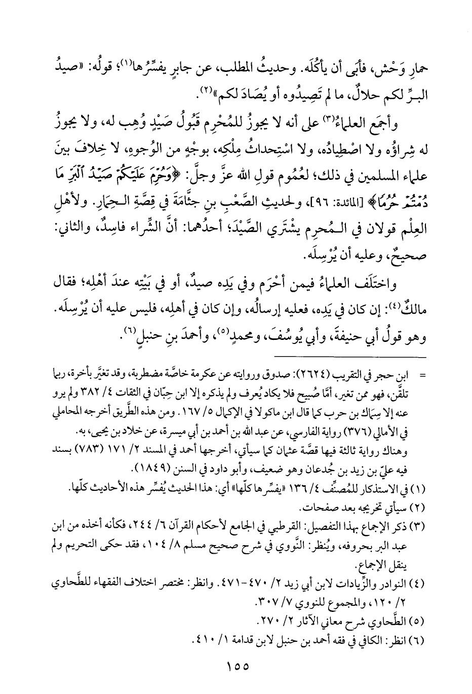 وأجمَع العلماءُ (¬٣) على أنه لا يجوزُ للمُحْرِم قَبُولُ صَيْدٍ وُهِب له، ولا يجوزُ له شِراؤُه ولا اصْطِيادُه، ولا اسْتِحداثُ مِلْكِه، بوجْهٍ من الوُجوهِ، لا خِلافَ بينَ علماء المسلمين في ذلك؛ لعُمُوم قولِ الله عزَّ وجلَّ: {وَحُرِّمَ عَلَيْكُمْ صَيْدُ الْبَرِّ مَا دُمْتُمْ حُرُمًا} [المائدة: ٩٦]، ولحديثِ الصَّعْبِ بنِ جثَّامَةَ في قِصةِ الحَمارِ. ولأهْلِ العِلْم قولان في المُحرِم يشْتَري الصيْدَ، أحدُهما: أنَّ الشِّراء فاسِدٌ، والثاني: صحيحٌ، وعليه أن يُرْسلَه.