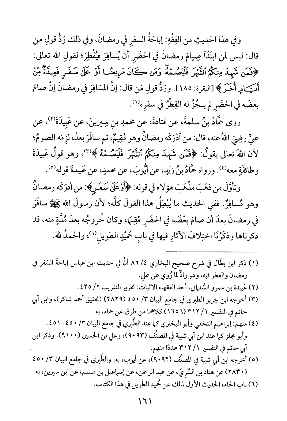 روى حمَّادُ بنُ سلمةَ، عن قتادةَ، عن محمدِ بنِ سِيرينَ، عن عَبِيد (¬٢)، عن عليٍّ رضِيَ اللهُ عنه، قال: من أدْرَكَه رمضانُ وهو مُقِيمٌ، ثم سافَرَ بعدُ، لزِمَه الصومُ؛ لأن اللهَ تعالى يقولُ: {فَمَنْ شَهِدَ مِنْكُمُ الشَّهْرَ فَلْيَصُمْهُ} (¬٣)، وهو قولُ عَبيد وطائفَةٍ معه (¬٤). ورواه حمَّادُ بنُ زْيدٍ، عن أيُّوبَ، عن محمدٍ، عن عَبيدةَ قوله (¬٥).