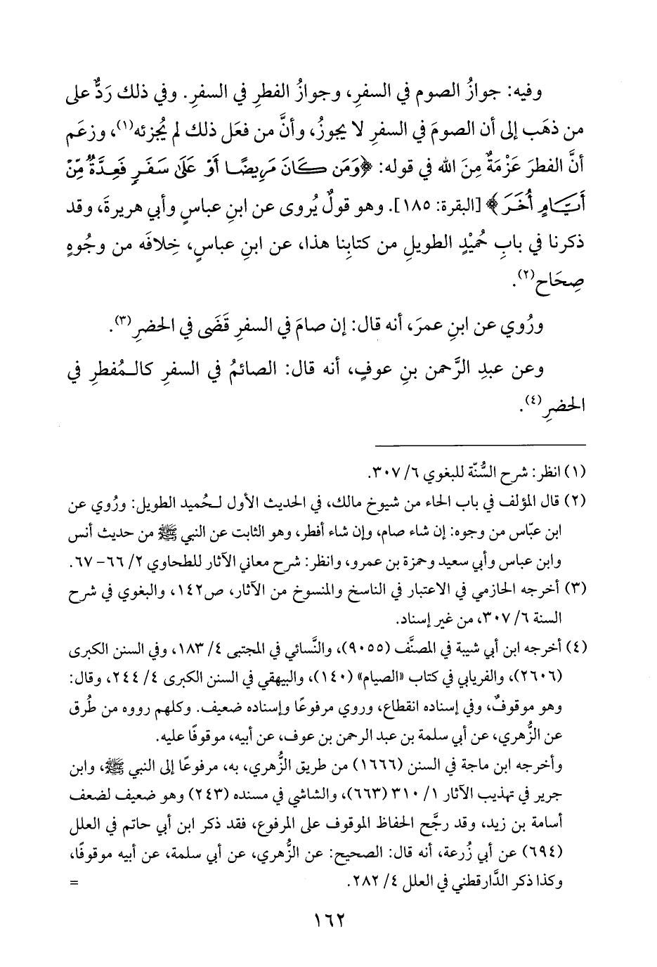 وعن عبدِ الرَّحمن بنِ عوفٍ، أنه قال: الصائمُ في السفرِ كالمُفطرِ في الحضرِ (¬٤).