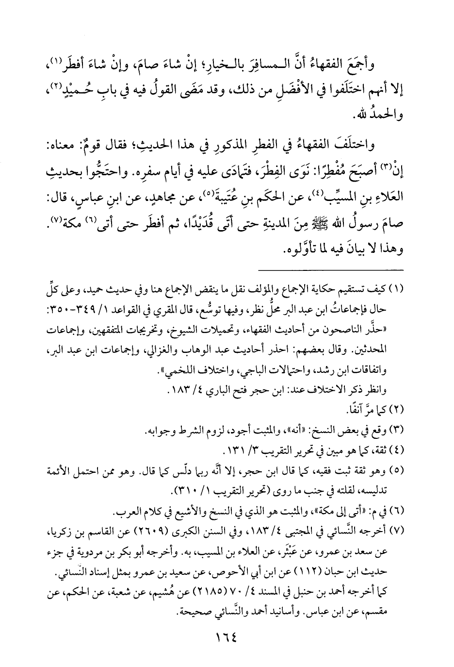 واختلَفَ الفقهاءُ في الفطرِ المذكورِ في هذا الحديثِ؛ فقال قومٌ: معناه: إنْ (¬٣) أصبَحَ مُفْطِرًا: نَوَى الفِطْرَ، فتَمادَى عليه في أيام سفرِه. واحتَجُّوا بحديثِ العَلاءِ بنِ المسيِّب (¬٤)، عن الحكَم بنِ عُتَيبةَ (¬٥)، عن مجاهدٍ، عن ابنِ عباسٍ، قال: صامَ رسولُ الله - صلى الله عليه وسلم - مِنَ المدينةِ حتى أتَى قُدَيْدًا، ثم أفطَر حتى أتى (¬٦) مكة (¬٧). وهذا لا بيانَ فيه لما تأوَّلوه.